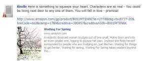 I stumbled on your book by accident. I’ve just recently downloaded the kindle app for my blackberry, and I was going thru the titles list, seeing what books there were to read at an affordable price. First of all the title “Waiting for Spring” caught my eye, then I read the brief description, and it intrigued me. I downloaded, thinking I would only read the first couple of screens, stop and pick it back up at a later time when I’m on vacation.